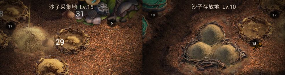 沙子采集地:工蚁把散落的沙子聚集起来用作蚁巢建设的材料,为蚁巢源源不断提供沙子,随着建筑等级的提高,其每小时产量也会随着提升