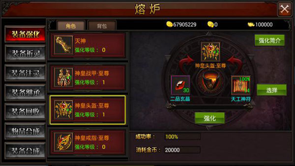 装备强化:装备在强化界面可以消耗玄晶和金币提升强化等级,放入天工神符可提升强化成功的几率。