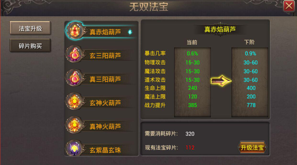 a.法宝可提升角色暴击几率、攻击、生命上限、魔法上限等属性;