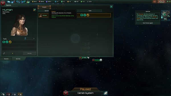 种族:这里显示出你的帝国的平民,在这里可以查看到人口的数量以及查看全星系的物种分布。