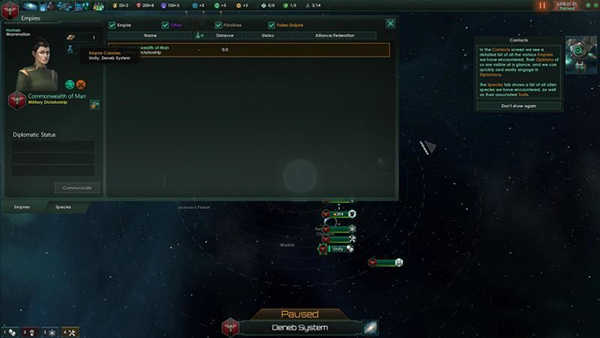 外交:顶项栏第三个按钮,显示已知的帝国和种族。