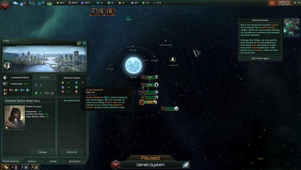 各项数值:可居住值(其百分比表示宜居程度)、能量值(①能量用来建造或升级星球、②为小型空间站提供动力)、矿物值(①建造或升级小型网络、②建造小型空间站)、食物(为人口以及农场提供伙食)、物理研发值(用以研究新的技术)、社会研究值(用来研发新的社会技术)、工程研发值(用来研发新的工程技术)、