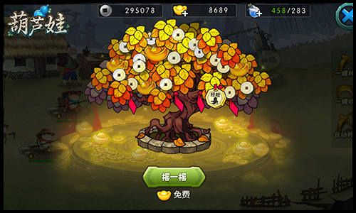 在葫芦娃的世界之中,有一颗山神赐给葫芦娃们的神树名叫摇钱树,在付出少量元宝的基础上,玩家们在葫芦娃中可以利用摇钱树获取丰厚的银币,为葫芦娃们购买装备碎片以便升阶,每日前几次摇钱树的性价比还是很高的,并且10倍暴击银币的几率也是非常可观,玩家们一定要珍惜机会啦,摇钱树银币掉落的哗啦啦声是不是很好听呢