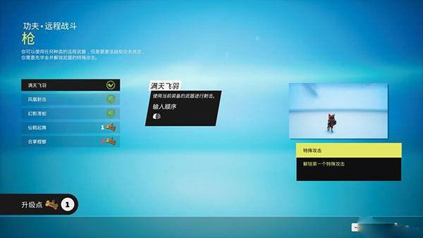 每个功夫的按键顺序和解锁技能点要求都有说明。