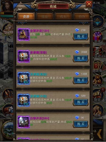 还可以在商城内直接购买增益效果或是直接购买资源箱快速获得资源。