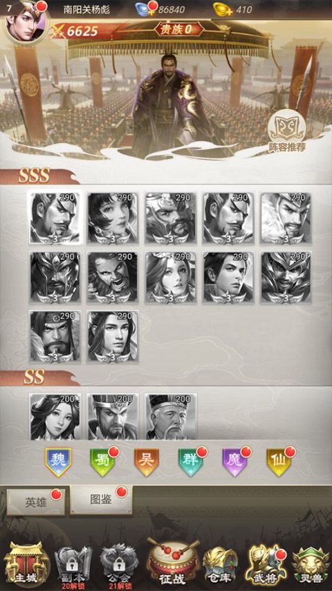 1、游戏内的武将分为魏、蜀、吴、群、魔、仙六大阵营,还有SSS、SS、S、A四大阶级,任玩家自由搭配组合。