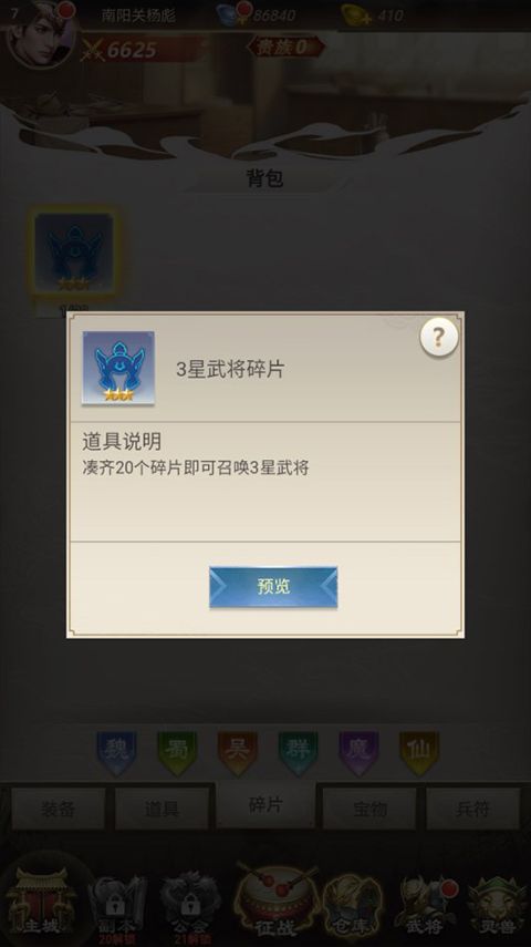5、玩家还可以通过碎片合成武将,在挑战关卡或者活动可以获得武将碎片,数量足够后即可在背包内合成武将。