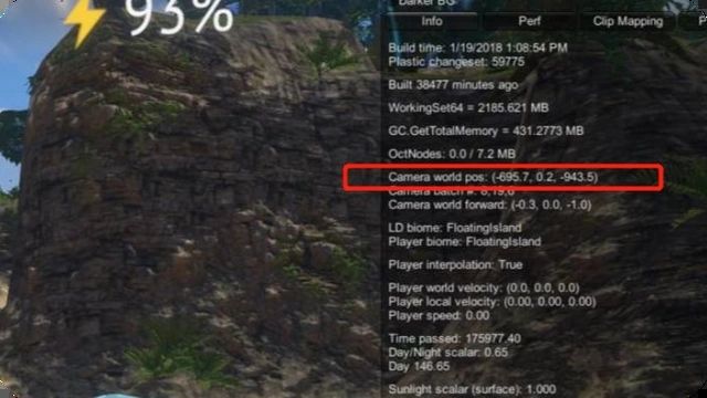 3、我们可在附近发现绿岛底部,按F1键查询所在坐标,并向(-695.7,0.2,-943.5)位置靠拢,可以找到登岛入口。