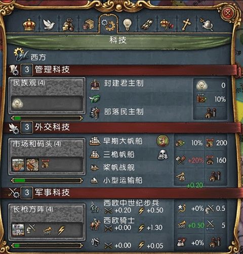 管理科技,外交科技,军事科技,分别对应行政、外交、军事点数,默认600点升级(唯一建筑大学,解锁理念,顾问,邻国科技比你发达,可以降低你的科研费用,当然也有一些增加科研费用的)。