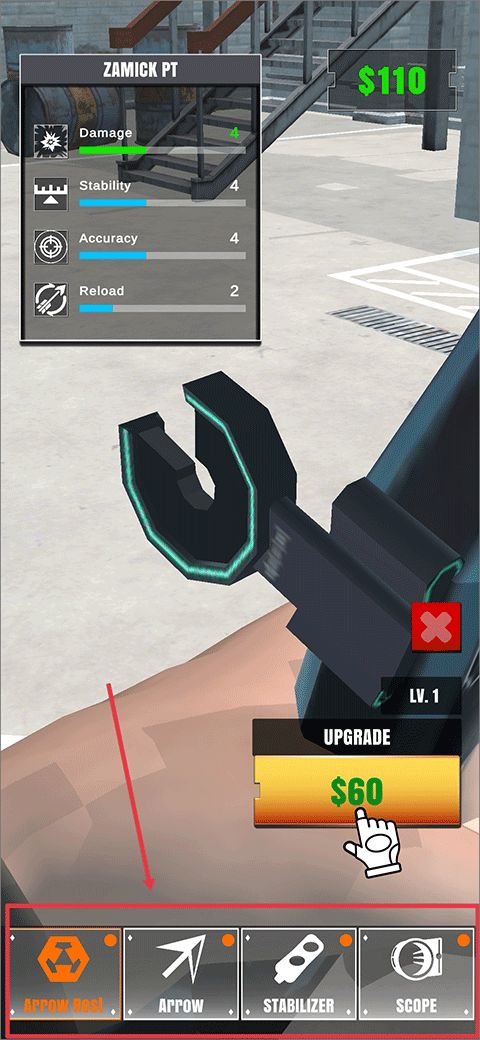 4、在游戏开始界面中的UPGRADE,你可以升级弓箭上的各个配件
