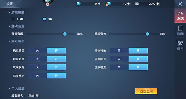 1、在系统这里可以设置游戏模式为2.5D或3D,游戏音量等;