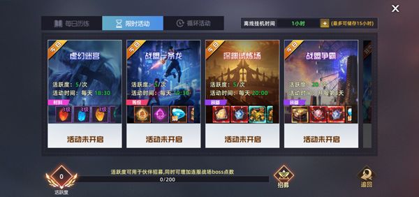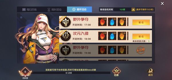 循环活动野外争夺、次元入侵活动较为特殊,全天循环,玩家在每个小时段都能参与,方便玩家调配游戏时间,舒适游戏。
