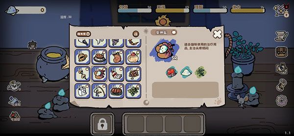 最后说一下游戏里我们为玩家便利设计的小按钮。右上角第一个小猫形状按钮是"状态与天赋",点击后可以看到猫猫携带的初始天赋与当前的状态,一些buff/debuff都能在状态栏中直观展示(还有一些游戏的小tips!)。天赋则是每次开局需要使用猫须点亮的增益,虽然只有当局有效,但一般都效果显著!另外:每次新开局都会赠送10点猫须,记得要使用哦!