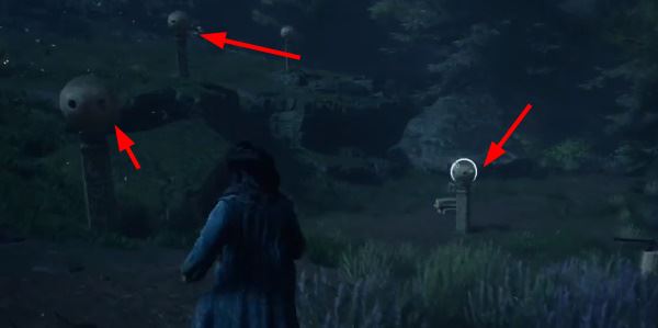 1、当我们领取解开梅林的试炼任务以后,我们在下图区域点燃三根柱子。(火焰会使柱子下沉)