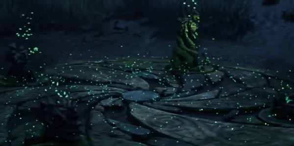 战斗结束后再次进入黑暗,使用荧光闪烁照亮道路,跟随荧光路线前进,会再次看到三个雕像倒影。
