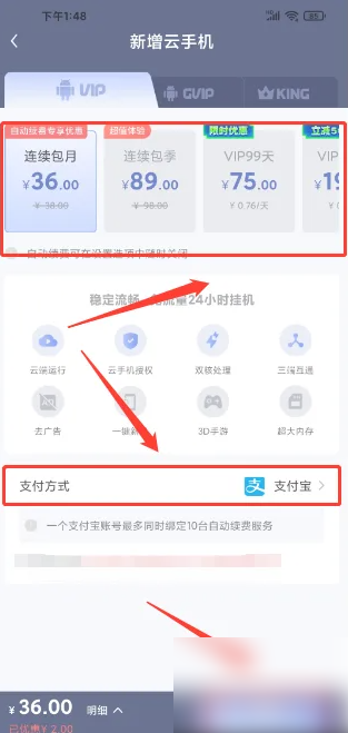 进入此伐新增云手机,选择套餐、支付方式,包国爷点击【确认协议并支付】。
