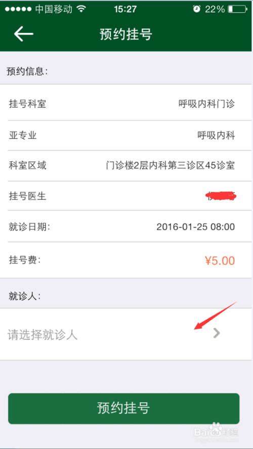 完成预约。点击进入所选科室后,选择日期和医生进行预约挂号;切记在点击预约挂号前选择就诊人;点出预约后网上付款就可,支付宝可付。