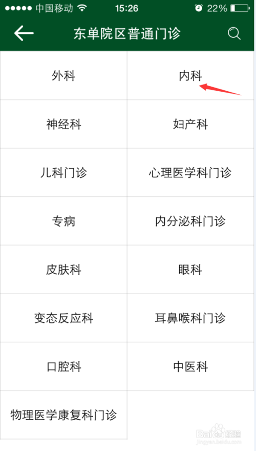 预约挂号。完成注册,返回主页,点击预约挂号就可进行预约,选择顺序为:(1)门诊选择(2)科室选择(3)细分科室选择。
