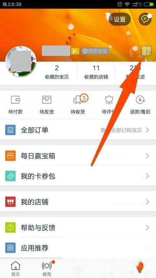 另一种就是通过扫描淘宝二维码名片来加好友了。手机淘宝的二维码名片在——我的淘宝,个人头像的旁边哦!