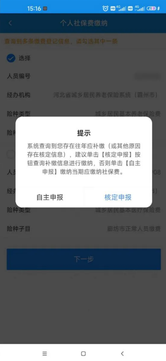 选择本次缴费险种,点击【下一步】查询应缴费信息,如界面提示有核定信息未缴费,说明社保部门或医保部门为该用户已核定应缴费数据,选择提示框的“核定申报”按钮进入“城乡养老核定申报或城乡医疗保险核定申报”界面;如果选择提示框的“自主申报”则进入“城乡养老自主申报或城乡医疗自主申报”界面。如果没有核定信息系统将自动跳转到自主申报页面。