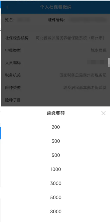 选择【自主申报】后,进入缴费界面,缴费人需要选择缴费年度、应缴费额(可以选择200、300、500、1000、3000、5000、8000,共7个档次)。