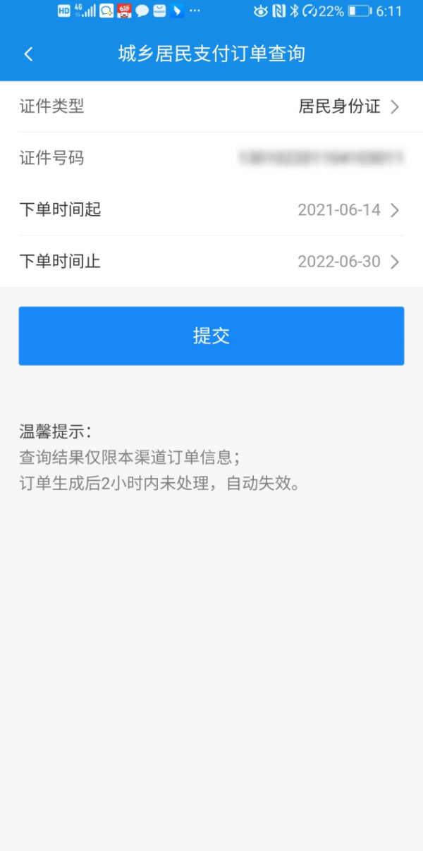 缴费人通过河北税务APP缴纳社保费后,通过此功能可以查询订单记录。输入证件号码,下单时间,单击【提交】按钮