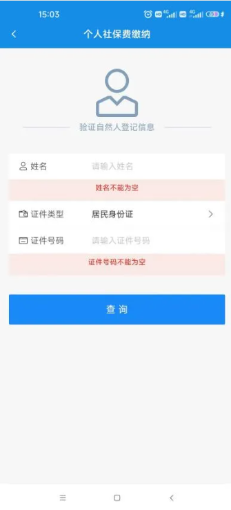 选择“个人社保费缴纳”输入姓名、证件号码点击查询按钮;