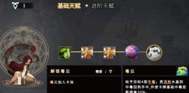 3号位蝎子娘,只需要2张卡组,毒云和萃取。最低要求点出基础天赋毒云,进阶天赋有条件可以点出强化萃取概率多抽牌。毒云配合毒水晶开始快乐套娃之旅,只要手牌上有一张毒云,就能把这套娃游戏进行下去。另一张神技萃取用于捞天蛛的牌,好坏坏哦。卡组最低2张毒云防误操作,剩下的给萃取吧。