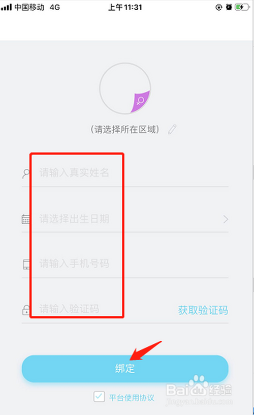用户绑定界面,输入真实姓名、出生日期、手机号和验证码,点击“绑定”。