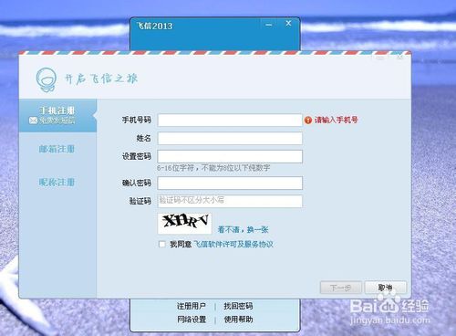 单击“昵称注册”按钮后会出现如图所示,这时我们将输入框里面的信息输入进去,输入完成后认真阅读“飞信软件许可及服务协议”,阅读完成后如若没有问题的话,那么我们单击下方的“下一步”按钮。
