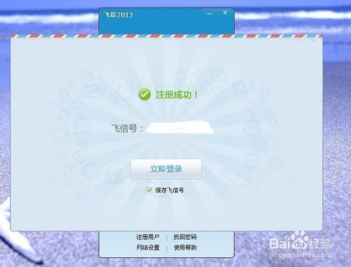 单击“下一步”按钮之后会出现如图所示,这时会提示我们已经注册成功了,会提示你的飞信号是多少,这时我们要牢记自己的飞信号以及飞信密码哦!