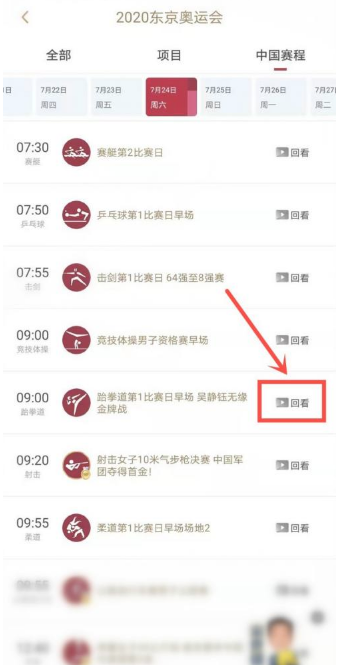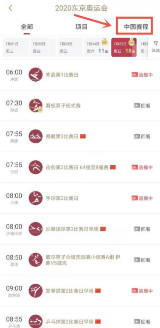进入奥运赛程界面,点击【中国赛程】,即可筛选出中国队比赛。