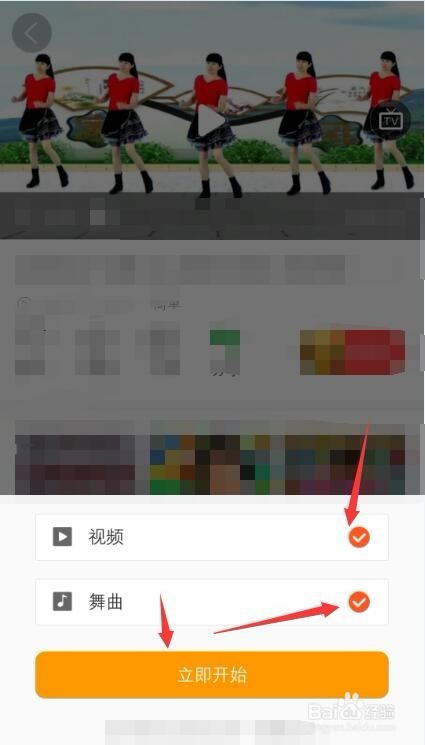 点击下载之后在下方弹出小窗口,其中可选择下载舞曲和视频,可单选也可以全选,然后点击立即开始。