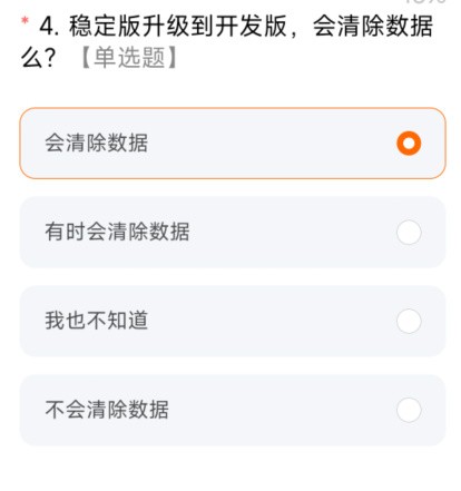 4、稳定版升级到开发版,会清除数据么?【单选题】