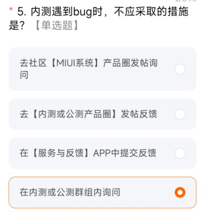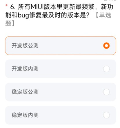 6、所有MIUI版本里更新最频繁,新功能和bug修复最及时的版本是?【单选题】