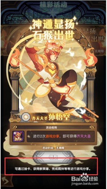 进入活动后,可以看到,要领取孙悟空,需要进行2次游戏分享,一些小伙伴可能不知道怎么分享,其实下面已经写了,可以通过抽卡,获取新英雄,完成羁绊来分享,如图所示。