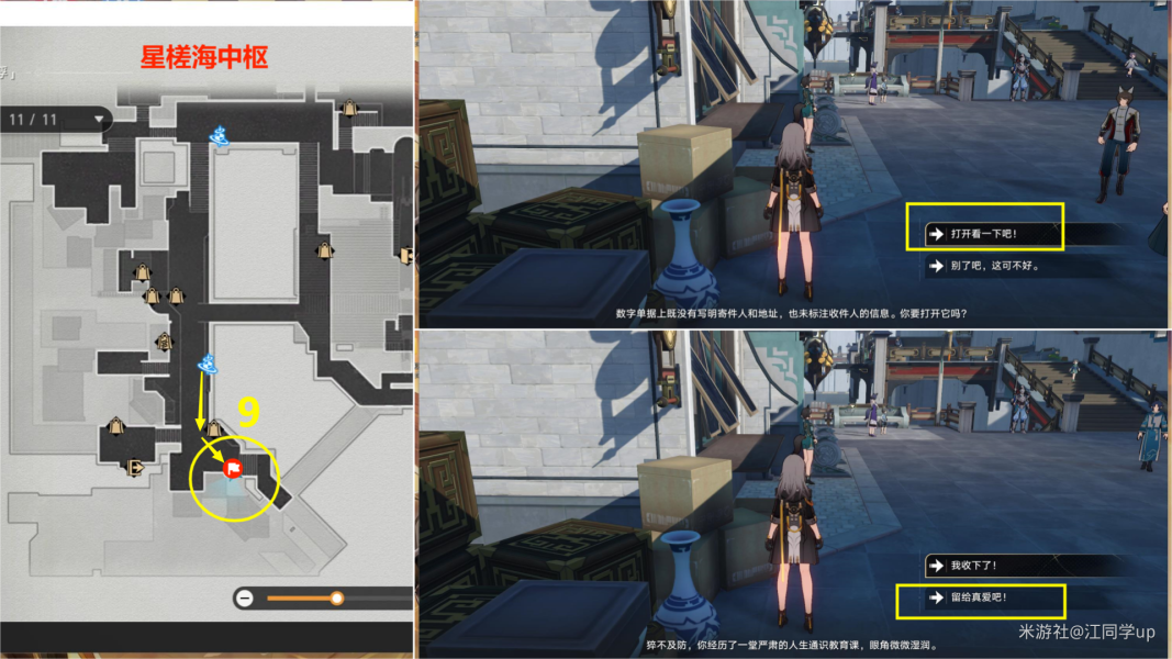(5)第9个位置,之前写过攻略,如果你还没【调查】过,【调查】后依次选择【打开看一下吧!】→【留给真爱吧!】后,可获得1个【崇高道德的赞许】,如果后面选第2个【我收下了】,则获得1个【好看的垃圾】
