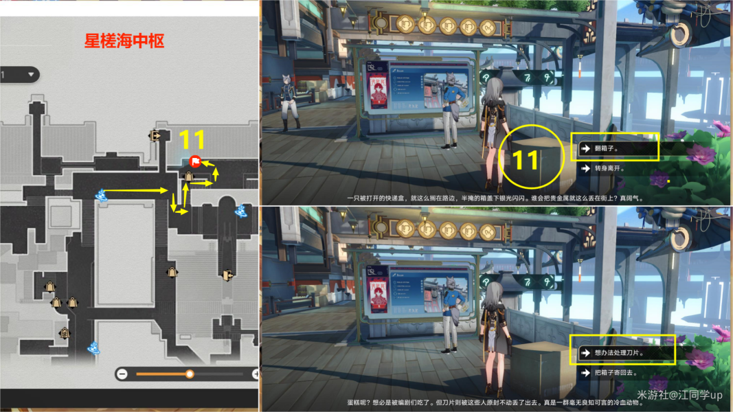 (7)第11个位置,之前写过攻略,如果你还没【调查】过,【调查】后依次选择【翻箱子】→【想办法处理刀片】后,可获得1个【崇高道德的赞许】