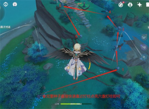 2)、然后按图中顺序依次,点亮石柱(雷种子靠近石柱就会发出淡紫色的光)