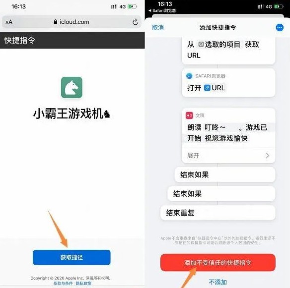 3、复制快捷指令链接到浏览器打开,点击获得获取捷径,会自动跳转到快捷指令app,往下拉添加不受信任快捷指令。