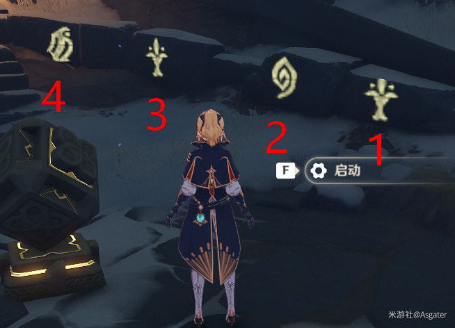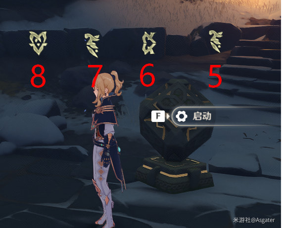 首先,这个洞窟的位置位于龙脊雪山这唯一一个七天神像的后左斜下方。其中,映入眼帘的便是一排符号,自右向左依次标记为1-8