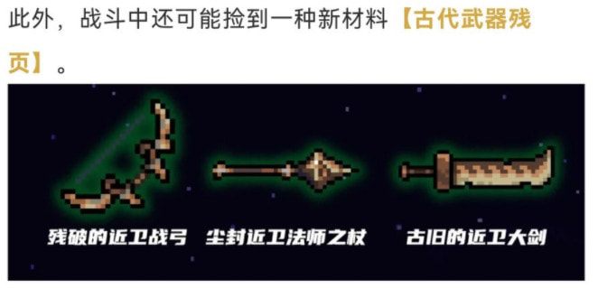 1、首先我们在地牢战斗中,可以会捡到古代武器残破的近卫战弓、古旧的近卫大剑以及尘封近卫法师之杖,并且战斗中还可能捡到一种新材料古代武器残页。