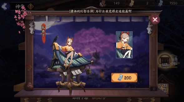 天井下只能通过神龛获取哦,200御札获取一整只,吃满技能要12只,几乎是三、四轮更新会有一次兑换,因此要提前攒好御札嗷!