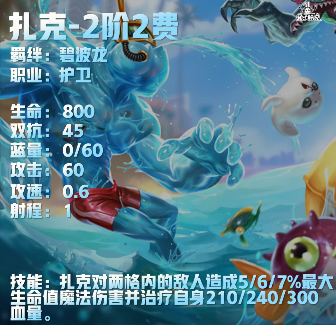 扎克技能:扎克对两格内的敌人造成5/6/7%最大生命值魔法伤害并治疗自身210/240/300血量。