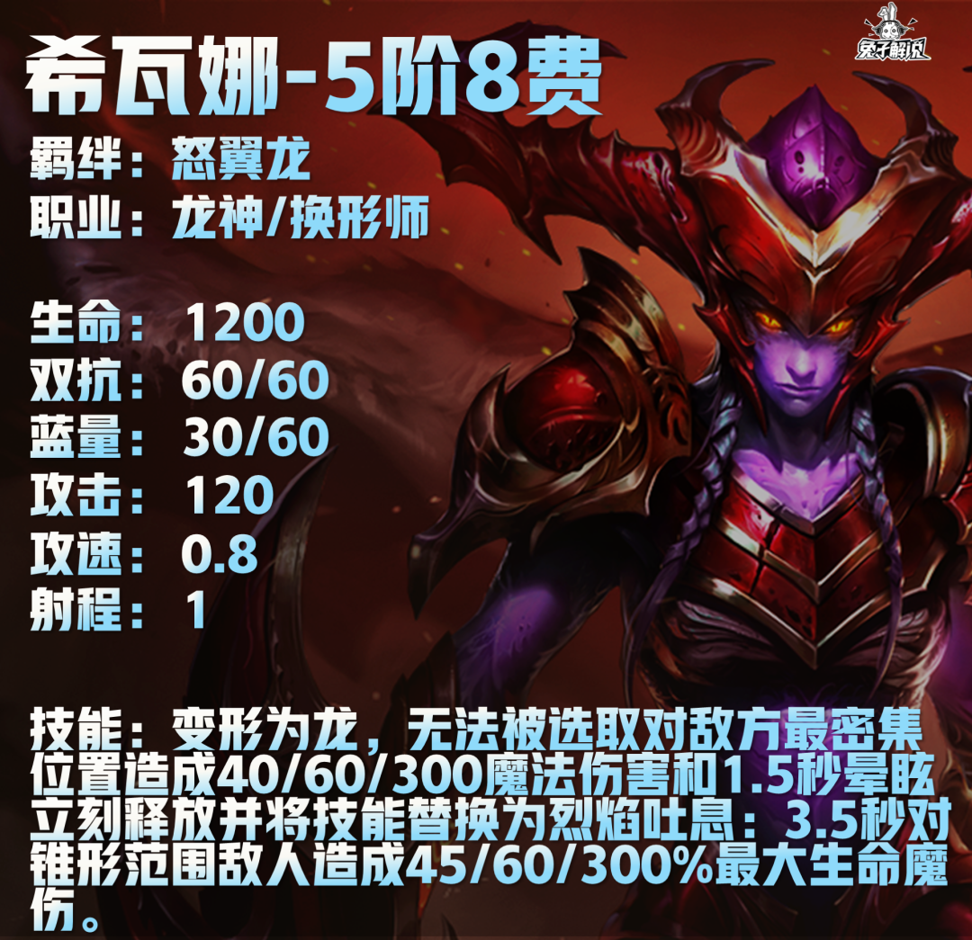 希瓦娜技能:变形为龙,无法被选取对敌方最密集位置造成40/60/300魔法伤害和1.5秒晕眩立刻释放并将技能替换为烈焰吐息:3.5秒对锥形范围敌人造成45/60/300%最大生命魔伤。