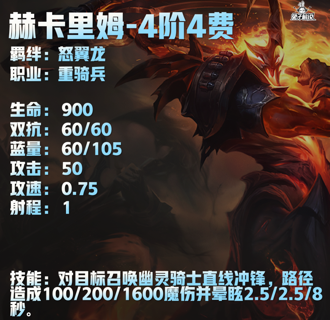 赫卡里姆技能:对目标召唤幽灵骑士直线冲锋,路径造成100/200/1600魔伤并晕眩2.5/2.5/8秒。
