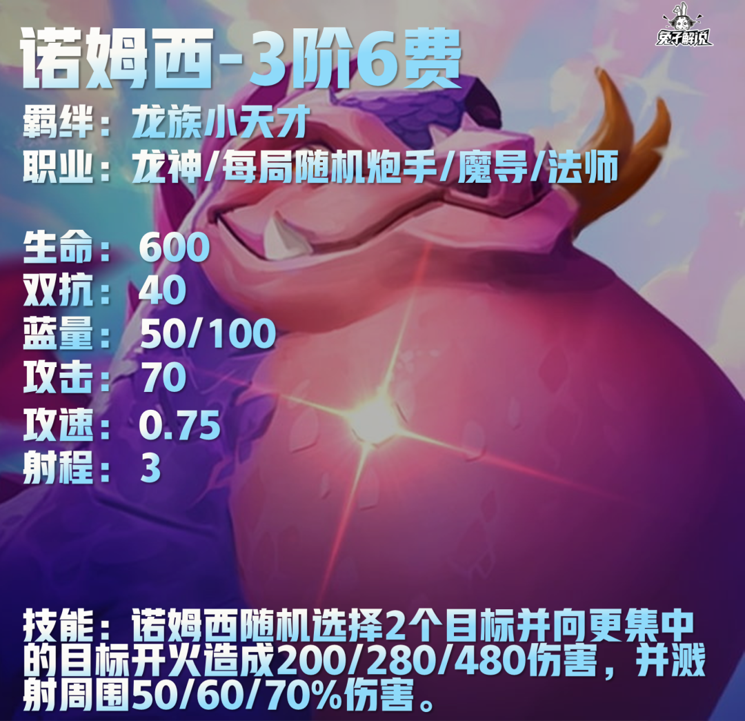 技能:诺姆西随机选择2个目标并向更集中的目标开火造成200/280/480伤害,并溅射周围50/60/70%伤害。