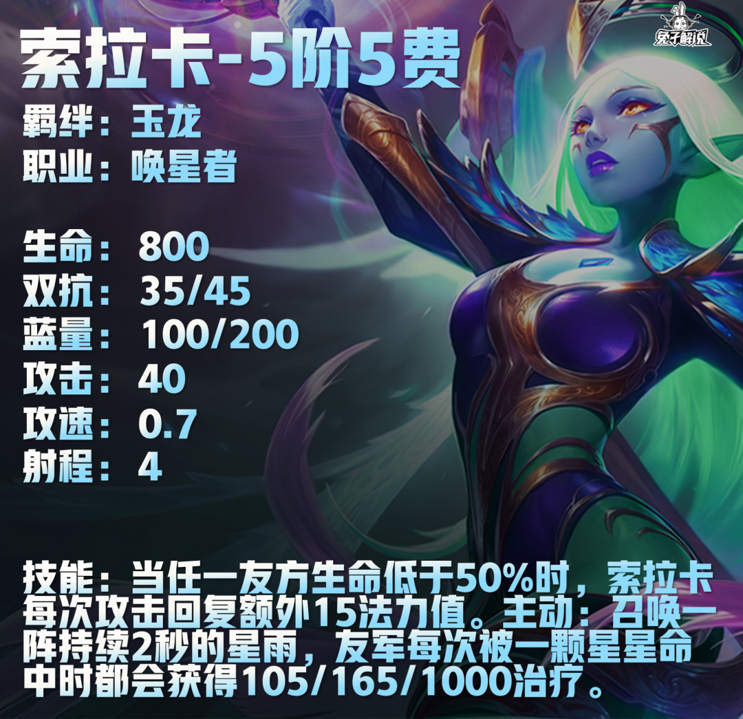 索拉卡技能:当任一友方生命低于50%时,索拉卡每次攻击回复额外15法力值。主动:召唤一阵持续2秒的星雨,友军每次被一颗星星命中时都会获得105/165/1000治疗。