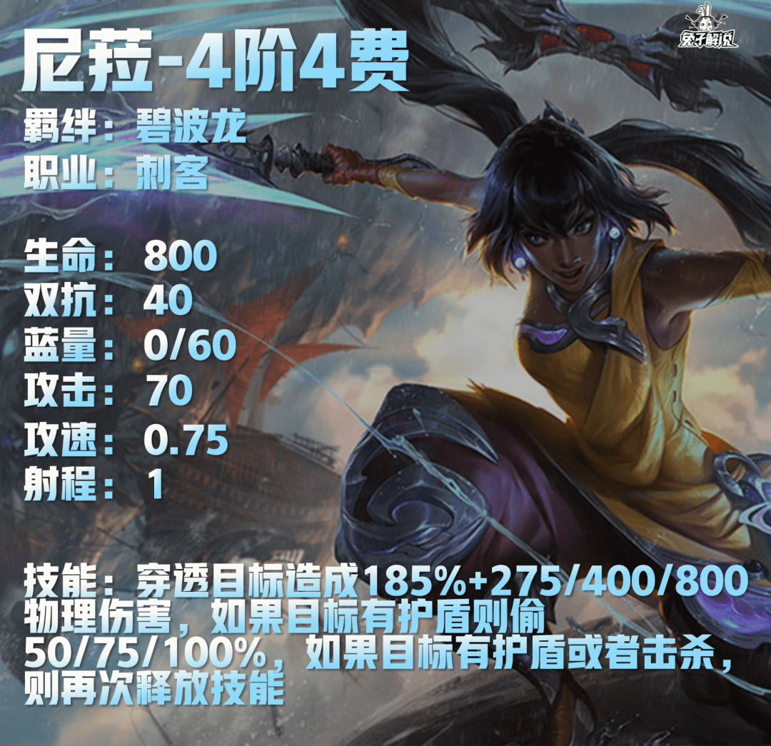 尼菈技能:穿透目标造成185%+275/400/800物理伤害,如果目标有护盾则偷50/75/100%,如果目标有护盾或者击杀,则再次释放技能
