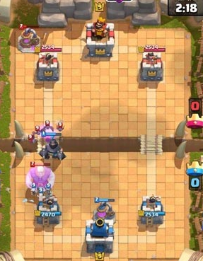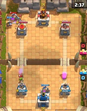 3、后期当我们累积了较多的费用优势后,可以分路在两边打出三个火枪手的压制进攻,对手一旦费用不足,会很难抵挡两路的进攻,从而公主塔损失很多的血量。